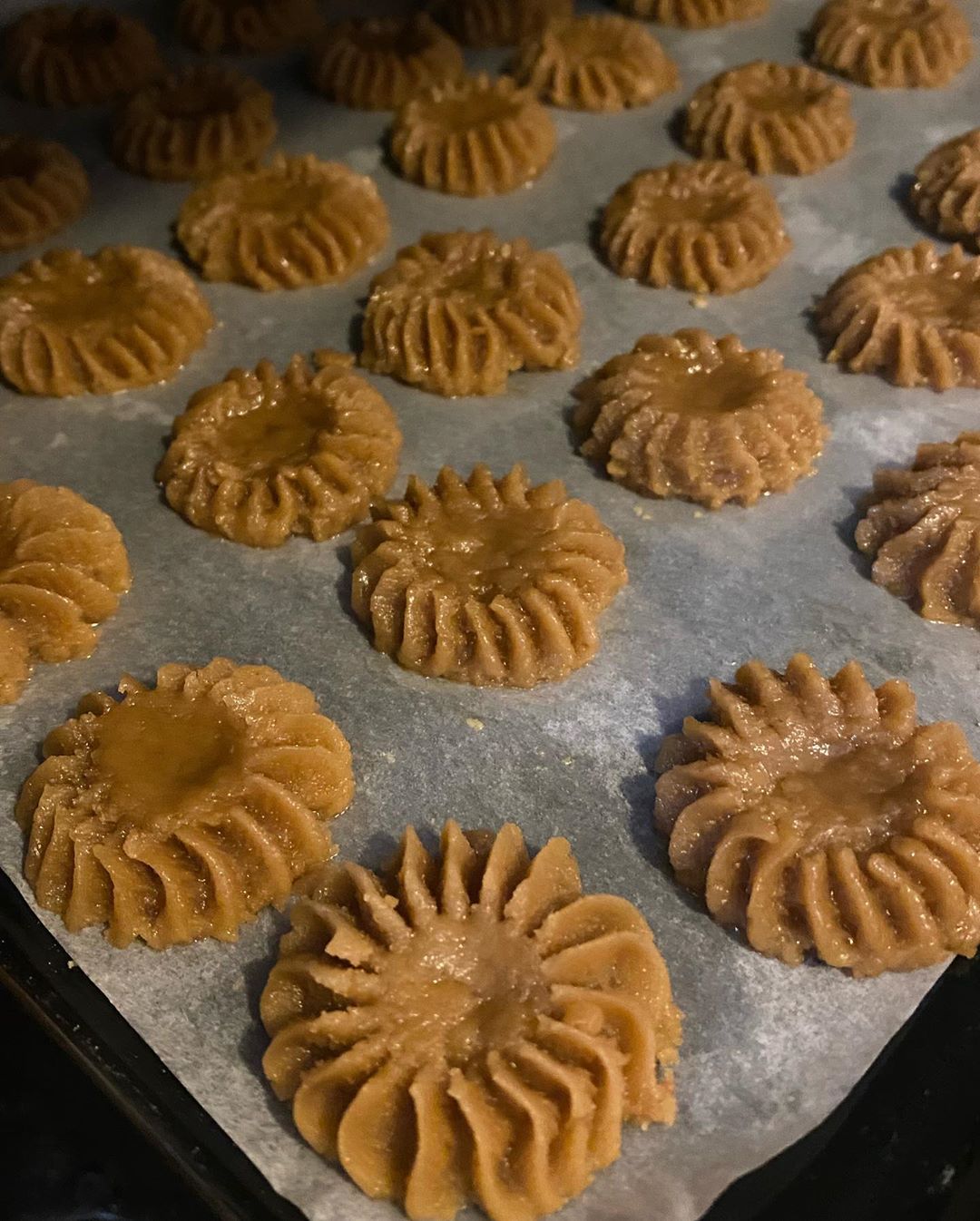 ثم في صينية الفرن نخرج العجين من اللمبوط على شكل وردة