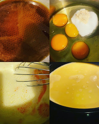 وكنخليه يقساح وكنخلط : 4 بيضات و نصف لترو د الحليب 4 معالق سكر واحد فلان شينوا