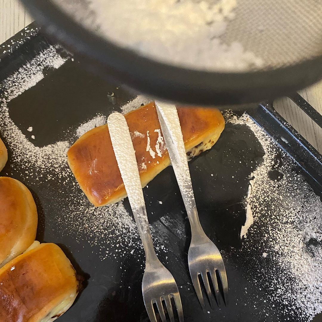 قطعتا مستطيلات وخليتا تخمر و ذهنتا بالبيض ملي كتحمر خرجتا وخليتا تبرد عاد رشيت عليها السكر