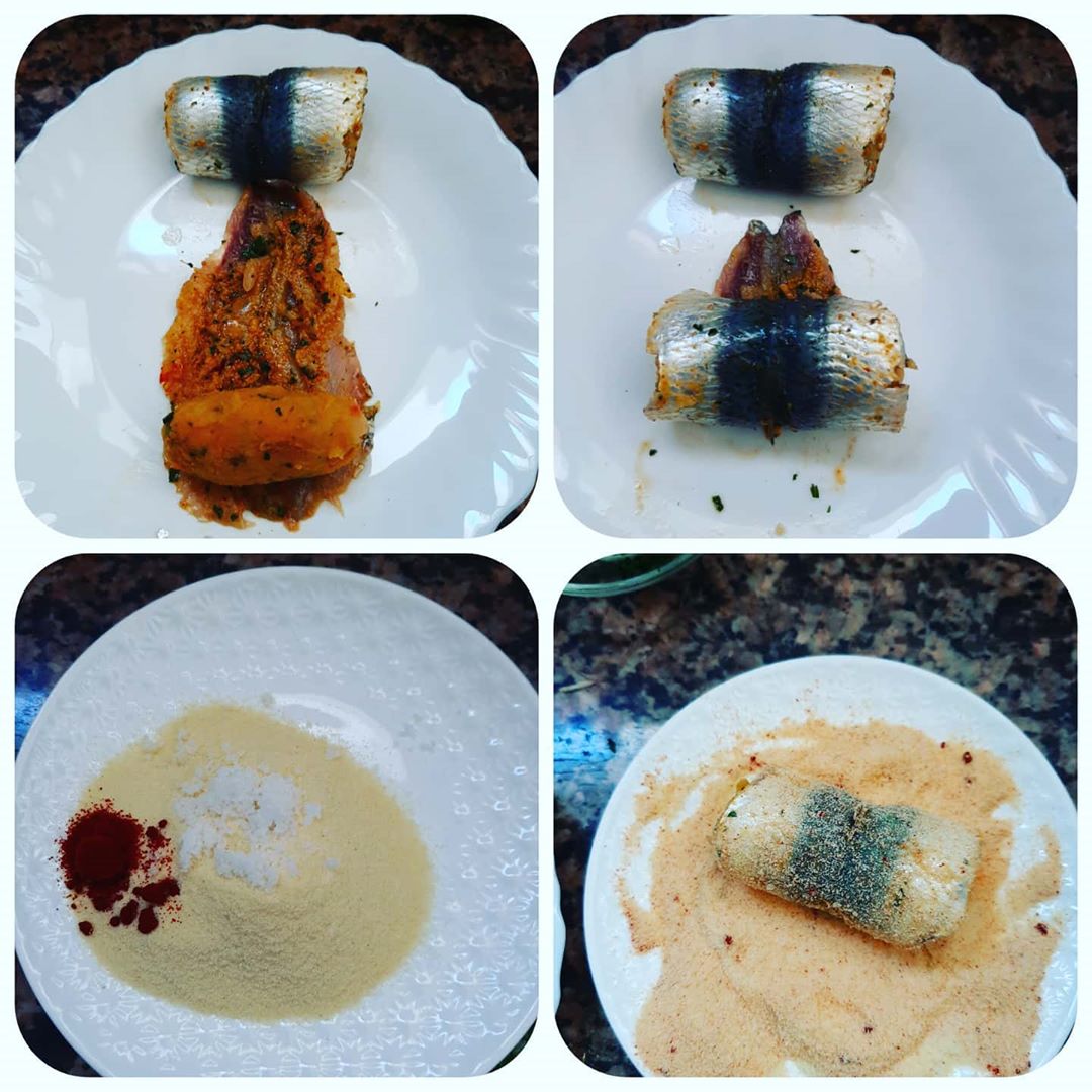 نعمرو السردين بحشوة البطاطا و ندوزوه فدقيق الفينو لي مضاف اليه شوية الملحة و شوية تحميرة