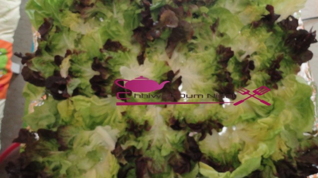 نفرش الطبق بالخس و نضع فيه اللحم و نصفف الخضر المبخرة في الجوانب