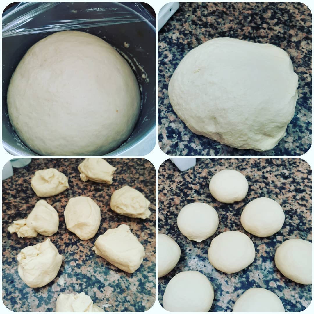 نخرج من العجين الهواء ونشكلها كريات أنا قسمتها على 8 قطع كل كرة فيها 115غ