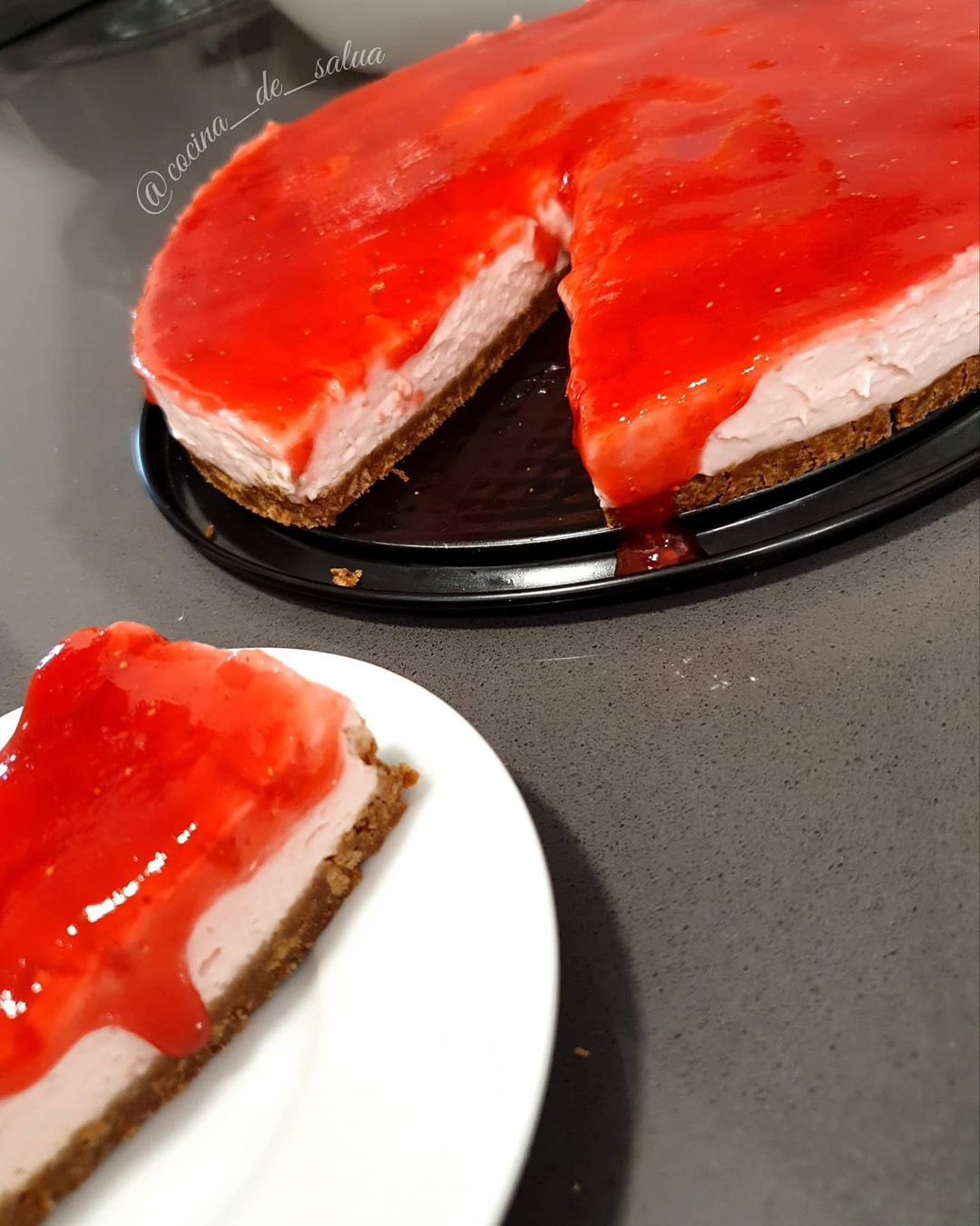 و في هاد الأثناء كنوجدو صلصة الفريز، كنحتاجو واحد 7 حبات فراولة كنطحنوهم في الخلاط مع اقل من نصف كأس ماء او نطحنو حتى نحصلو على عصير او نصفيوه في كاسرول او نضيفو عليه ملعقة صغيرة عصير ليمون + نصف كأس سكر او نشعلو نار متوسطة مع التحريك حتى يتقال بحال الكونفيتور او نطفيو عليه و نضيفوه فوق الكريمة
