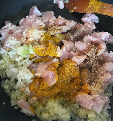 في مقلاة نضع الدجاج والبصلة و شوية د الزيت و ملح و التوابل