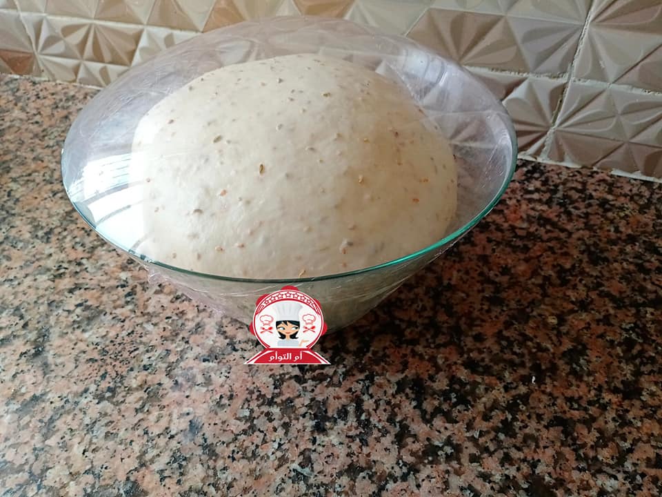 تخلط المكونات مع بعض و نعجن جيدا مع اضافة الماء شيئا فشيئا حتى الحصول على عجين لين لا يلتصق كثييييرا باليد فقط خفيف و فنفس الوقت شاد راسو نترك يختمر حتى يتضاعف حجمه