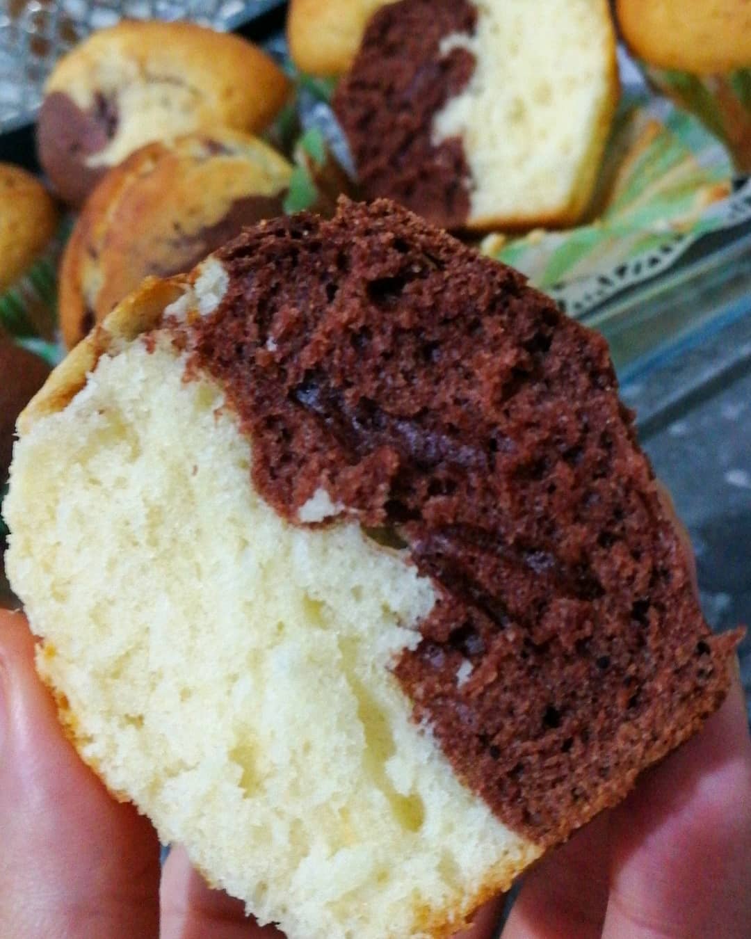 الخليط كيكون ثقيل شوي سواء العادي او اللي بالكاكاو باش ما يتمزجوش أثناء الطهي