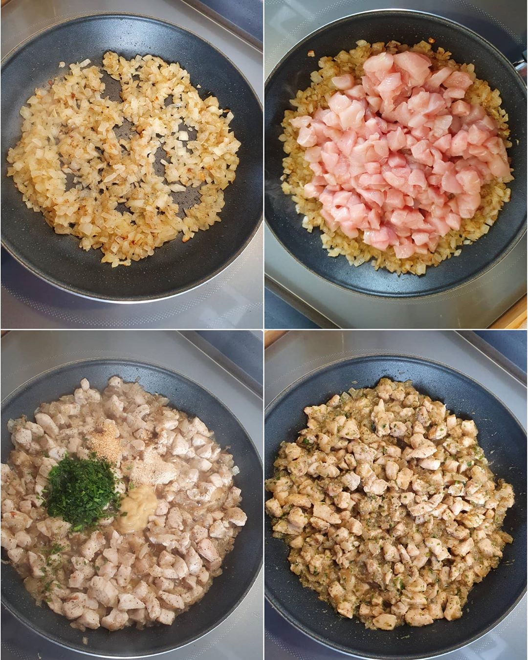 في مقلاة نضع البصل مع الزيت و الملح الى ان يذبل و يتحمر نضيف قطع الدجاج ابزار ثوم زنجبيل و البقدونس