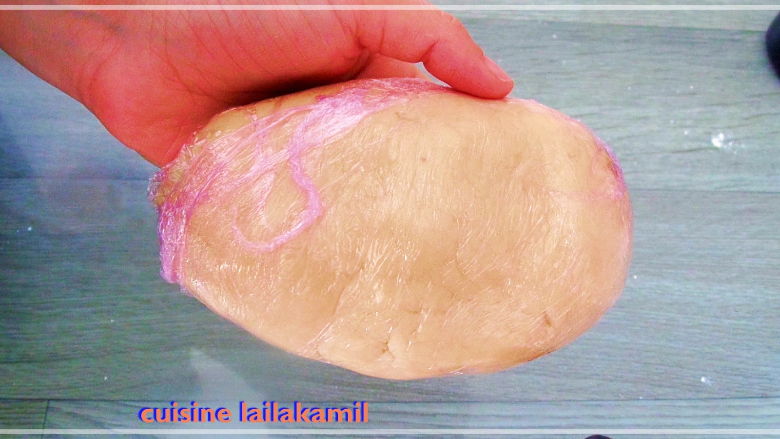 نخلط مقادير العجين ونجمعها جيدا برؤوس الاصابع حتى تتماسك جيدا ثم ندلكها جيدا حتى تصبح لينة ومتماسكة ونتركها ترتاح 10 دقائق مغلفة بكيس غدائي