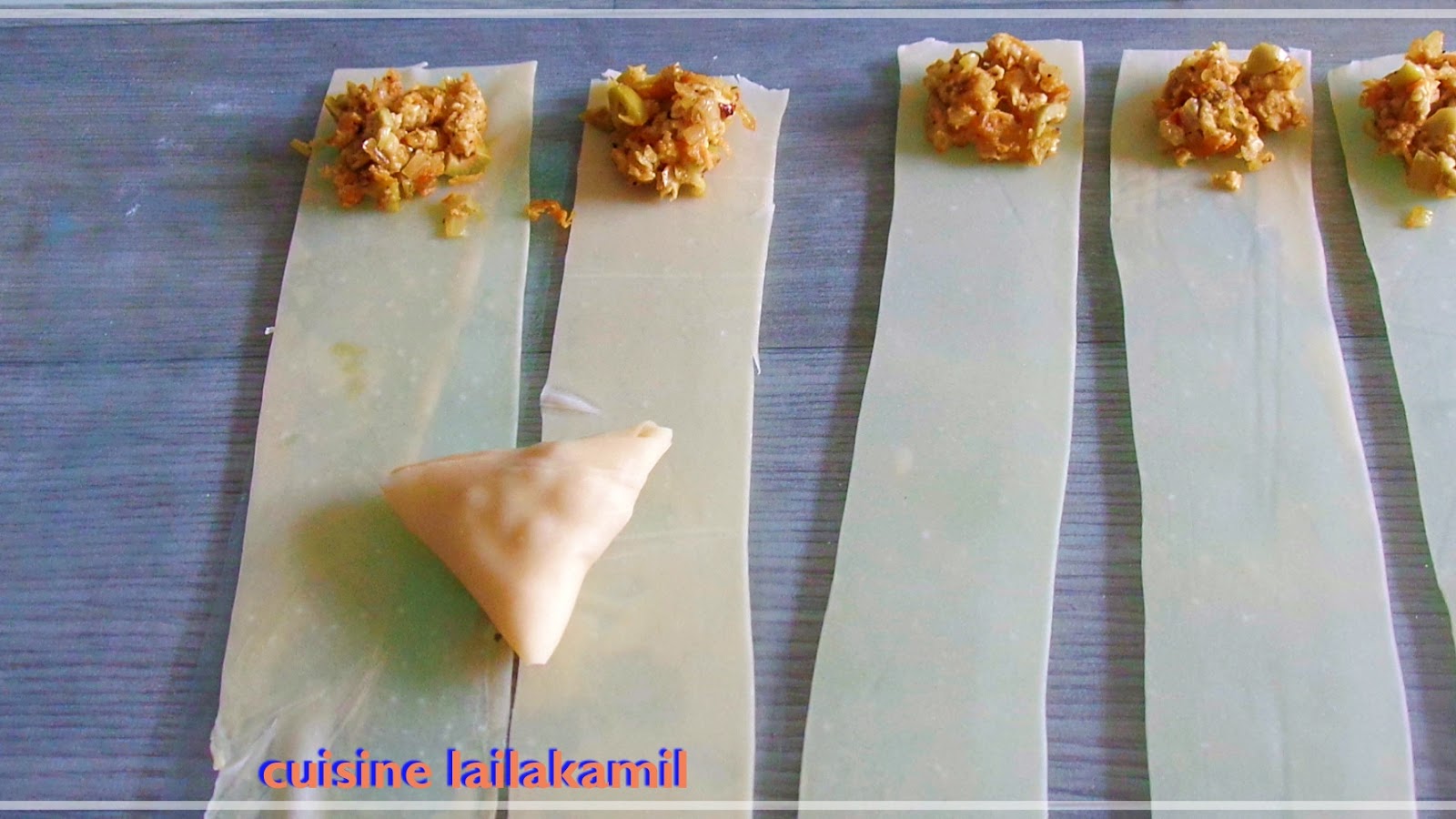 نضع الحشوة في اول الشرائط ونلف على شكل بريوات