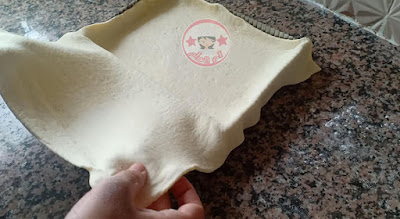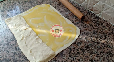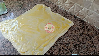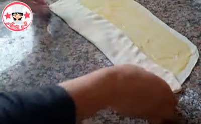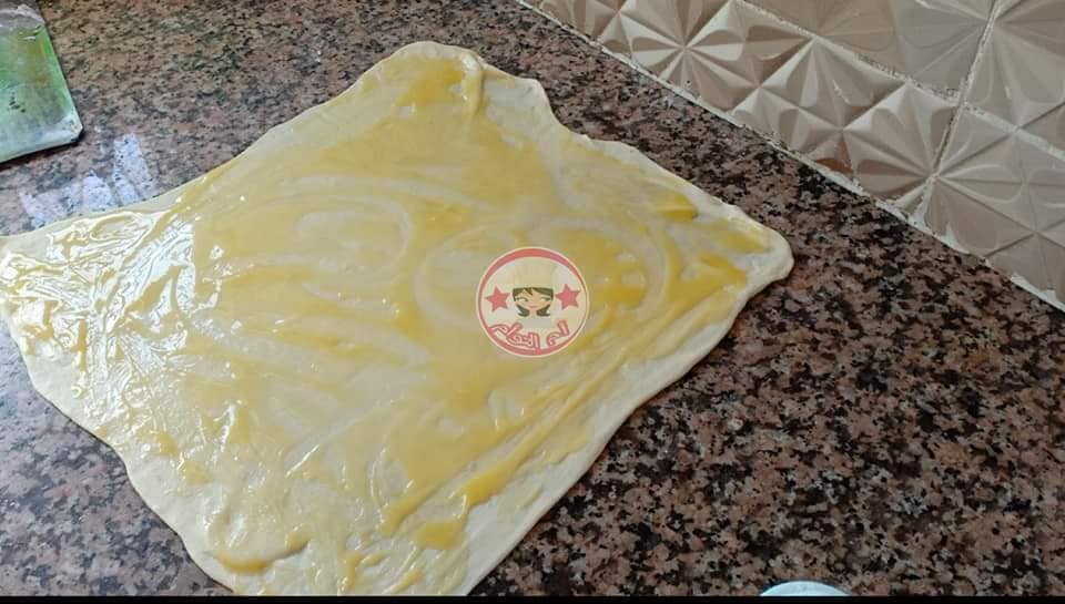نبسط القسم الثاني من عجين مسمن و ندهنه كذلك بالزبدة و نضع فوق المستطيل الاول كما في الصورة