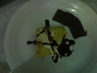 ترفع في طبق ويدهن سطحها بالمربى ثم يرش بقليل من شوكولا ثم يطوى على شكل نصف قمر ثم تطوى على شكل مثلث ونوضع في طبق التقديم