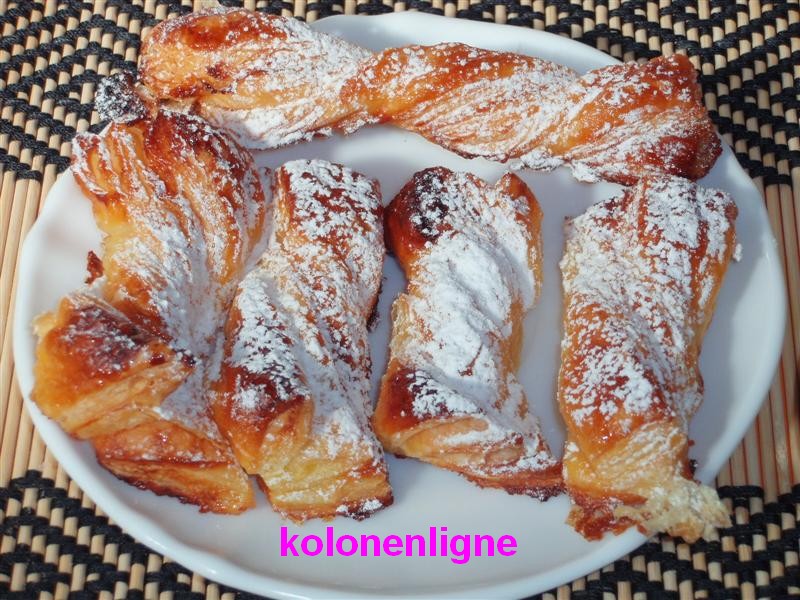 - تقطع العجينة شرائط صغيرة و نضع كل شريطين فوق بعض و نبرموهم ندهنها بصفر بيضة و ندخلها الفرن متوسط الحرارة الى ان تتحمر و نخرجها ونتركها تبرد قليلا و نرشها بسكر الصقيل