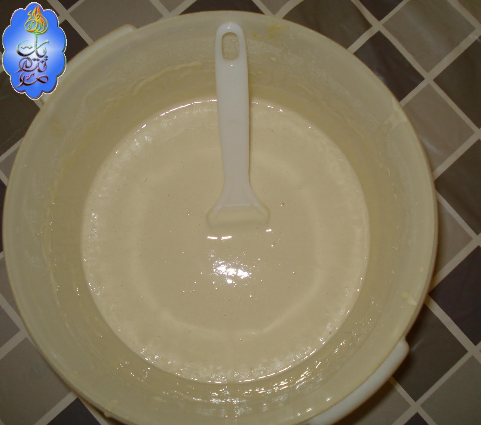 نقوم بوضع الدقيق في اناء نضيف إليه الملح “ما يكفي ” ونقوم بصب الماء تدريجيا مع التحريك حتي نحصل على عجينة لزجة شبه سائلة تشبه عحينة “البغرير”. كما هوموضح في الصورة التالية: