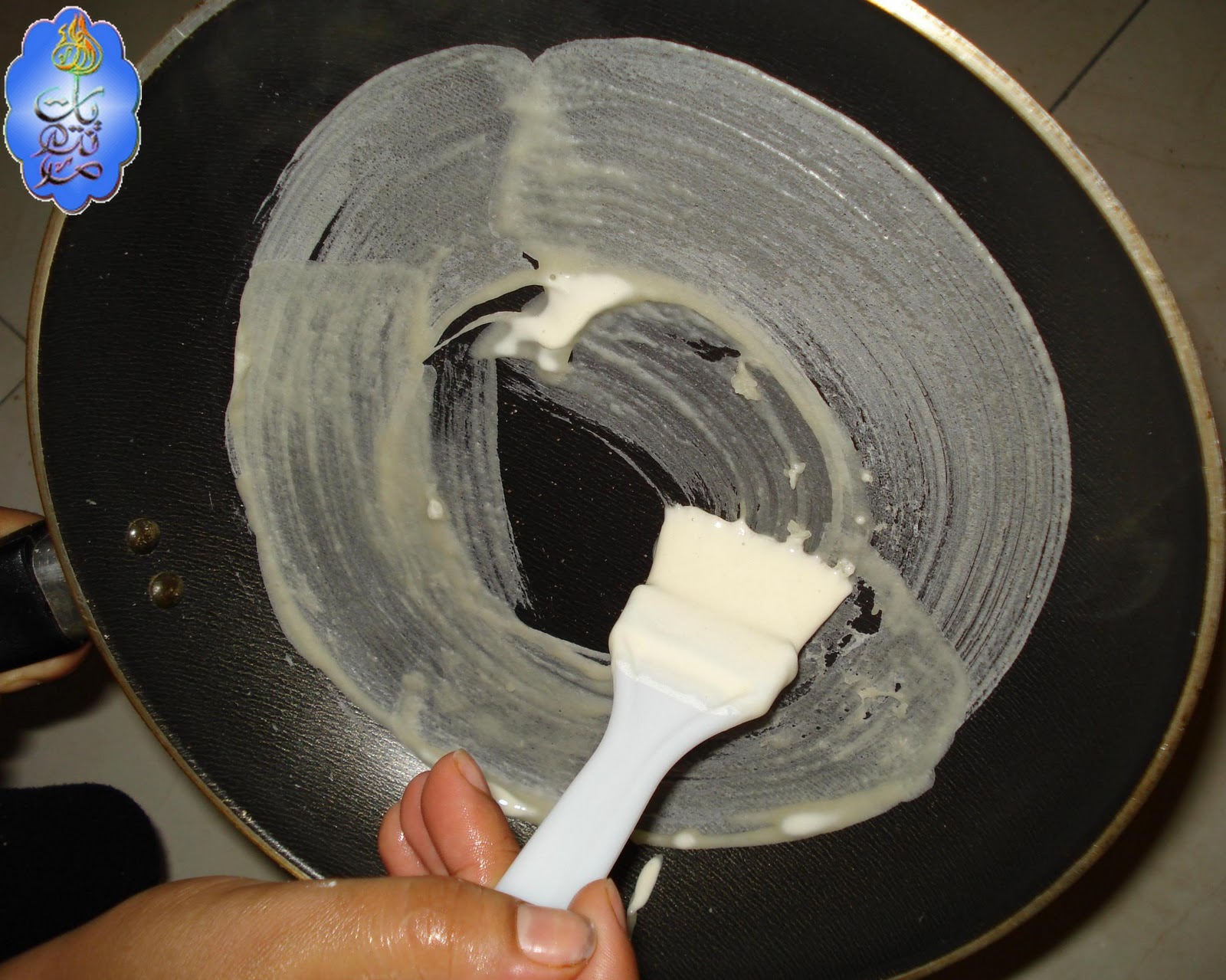 نحتاج إلى مقلاة من نوع “تيفال” (التي لا تسمح بلصق العجين ) نقوم بوضعها على النار قليلا ثم نقوم بوضع العجين على المقلاة بواسطة فرشاة كما هو موضح في الصورة التالية