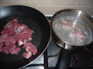 اولا نقلي اللحم في مقلاة مع القليل من الزيت والملح ويجب ان تكون النار قوية باش اللحم مايطلقش الما ويجي رطب اما إلى طلق الما كايجي عاصي ..