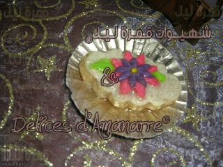 ثم كنرشوها بالملمعات حسب اللون المفضل 1كيلوغرام دقيق الفورصالممتاز الخاص بالحلويات 1كيلوغرام لوز بودرة(مسلوق و منقي و منشف و مطحون بدورة) 50 سنتيليتر زيت 350 غرام زبدة لينة او مذابة 350 إلى 500 غرام سكر سنيدة الكمية حسب حبكم للحلاوة 2 ملاعق كبيرة عسل ليمون 2 بياض البيض 150 غرام زبدة اقل او اكثر حسب نوعية اللوز