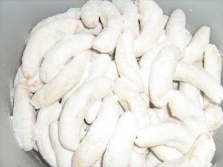 نمد العجينة تقطع دوائر ،نضع وسطها كويرة من حشوة التمر ونشكلها مثل الهلال مثل الصورة بعد إخراجها من الفرن وهي ساخنة تفند في السكر الناعم