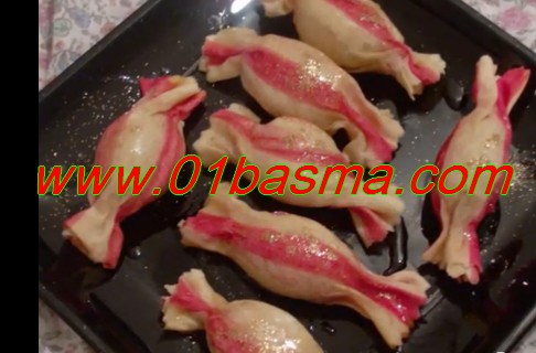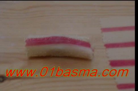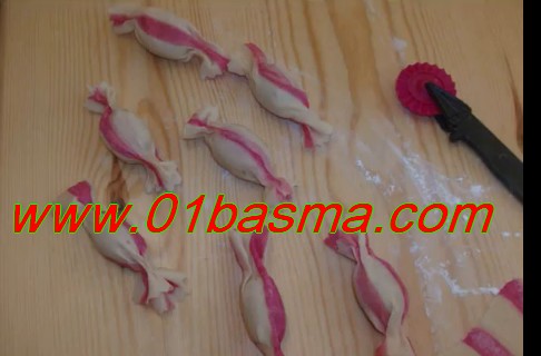 نبسط العجين ناخد بانسو و نعمل به شرائط بالملون الغدائي المفضل