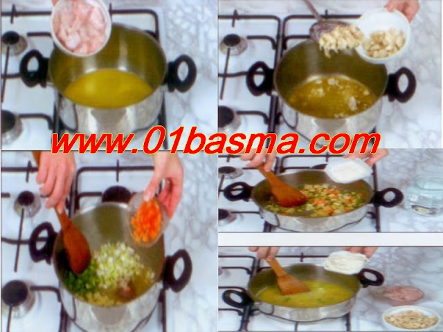 نقطع البورو و الكرافس و باقي الخضر الى قطع صغيرة نضعها في الطنجرة نتبلها بالملح و الابزار و نتركها لتتقلى قليلا ثم نضيف الدقيق و نترك الكل فوق النار لمدة دقيقتين