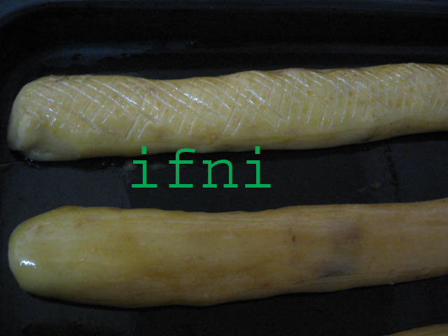 نصنع من العجين قضبان طويلة ثم تدهن بصفار البيض المخفوق مع نسكافي مذابة في قليل من الماء