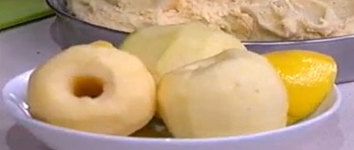 نقشر التفاح نزيل لبه كما في الصورة و ندهنه بعصير الحامض ليحتفظ بلونه