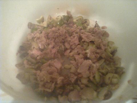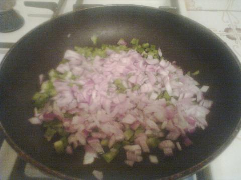 نشحرو االبصلة و الفلفلة مع شوية ملح و يبزار، نضيفو الزيتون و الطون