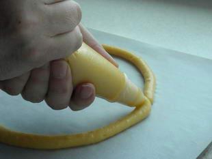 نضع العجين في جيب الحلواني و نشكلها دوائر كما في الصورة