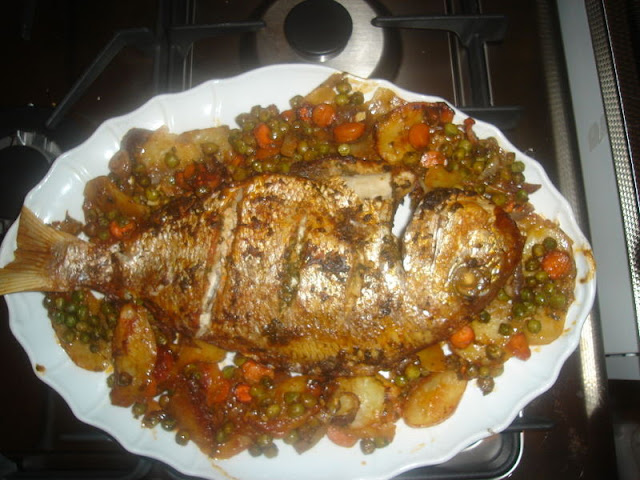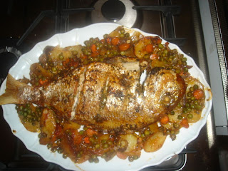 نشرملوا السمكة ونخليوها ترقد في صنية الفرن نقطع الجزر البطاطا الجلبانة الخضر حسب الرغبة