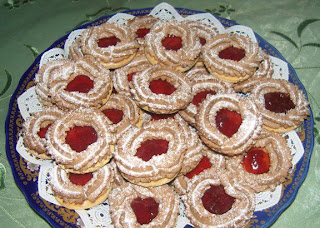 نخلطو المقادير العجينة البنية ، نتركها مرخوفة ونخرجوها بالبوق على شكل دائري بنفس قياس الدوائر البيضاء ، وندخلوها الفرن تطيب
