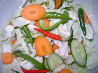 نقطع الخضار بالطول او دوائر ماعدا الفلفل الحار ونحاول ان تكون قطع الخضار رهيفه ونخلطها مع بعض