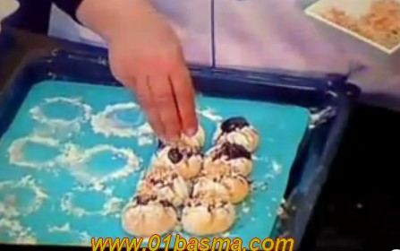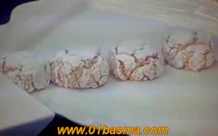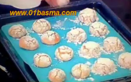نذهن ايدينا بعصير الحامض كي لا تلتصق العجين بهما و نحضير كويرات نضعها في السكر الصقيل من الوجه و نضففها في صينية فرن