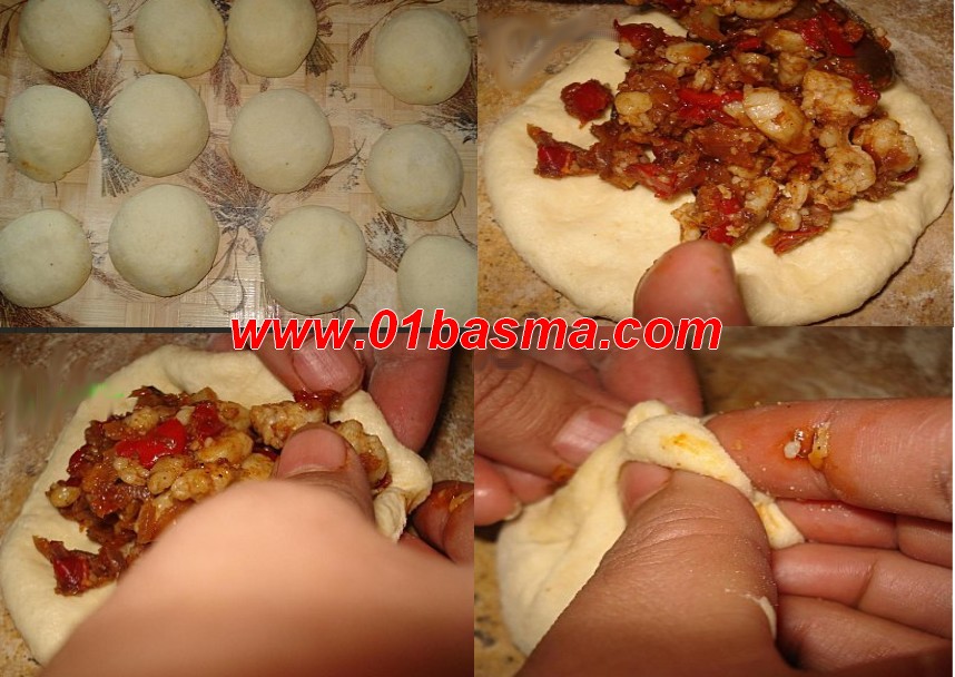 نبسطها نضع وسطها الحشوة و نجمع اطرافها
