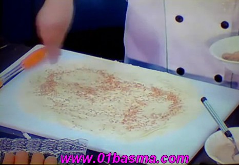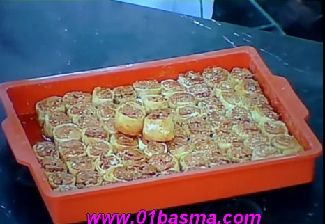 نلف ورق البسطيلة كما في الصورة و ندهنه بالزيت