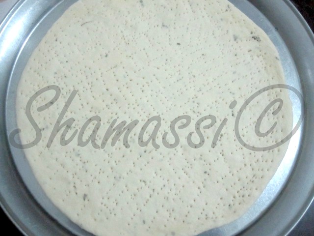 نترك عجين البيتزا حتى يخمر من بعد نبسطه و نثقبه بواسطة الشوكة