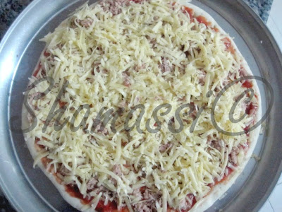 بعد اخراج العجين من الفرن ندهنها بالصلصة ثم نضع طبقة من الطون المعلب