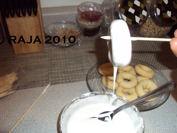 لما تطيبو نخلوها تبرد مزيان ونصيبو كلاصاج (بياض بيضة+150 غ سكر صقيل)نضرب البياض في الاول ثم نضيف السكر نستمر في الخفق حتى الحصول على كلاصاج عاقد نغطس فيه الكعكعات ونحطهم يتقطرو وينشفو من بعد نزينهم بخطوط من الكلاصاج الملون وورد بعجين اللوز