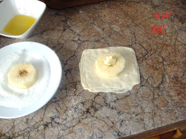 نمرر دوائر التفاح في سكر سنيدة ثم نضعها فوق العجين بعد ان نبسطه قليلا
