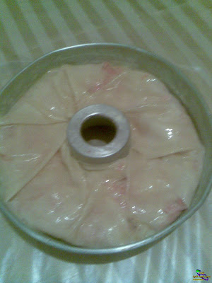 ناخذ قالب الكيك ندهنه بالزبدة و نفرش فيه اوراق البسطيلة بحيث ان اطراف الورقة تكون خارج القالب