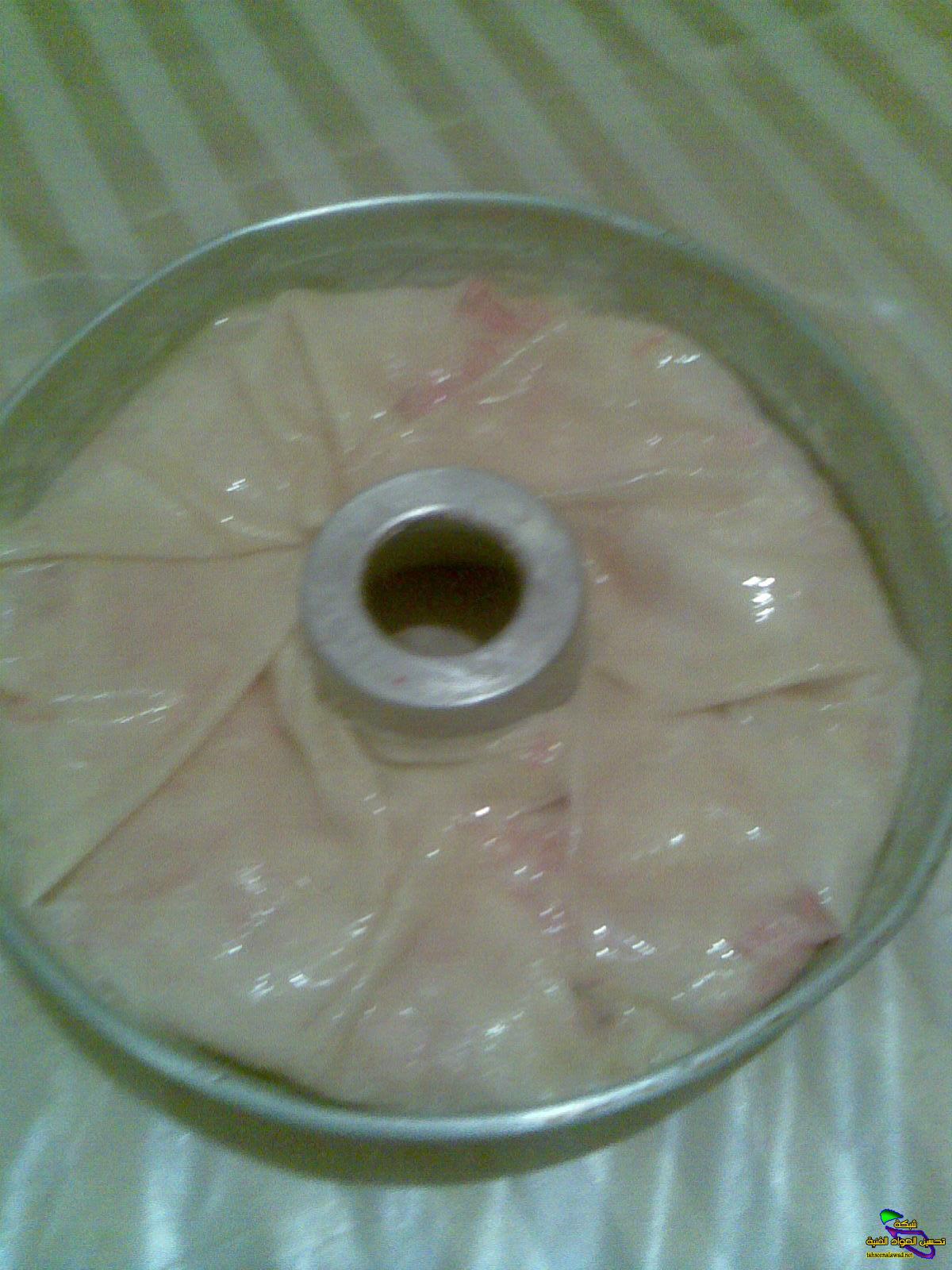 ناخذ قالب الكيك ندهنه بالزبدة و نفرش فيه اوراق البسطيلة بحيث ان اطراف الورقة تكون خارج القالب