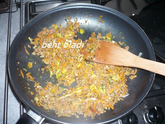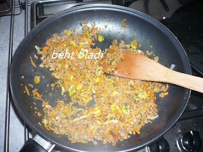 نشحر البصل مع القليل من الزبدة ثم نضيف الكفتة