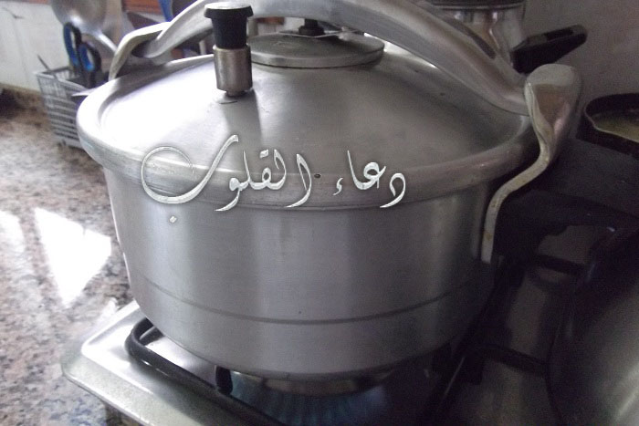 نضع اللحم فالكوكوت و تضيفين له معلقة صغير قزبر حبوب يكون مطحون من قبل + واحد ضريس تاع التوم صحيح و نزيد تقريبا 3 كيسان عنبة ماء ونسد عليه فالكوكوت متقليه مووالوووو
