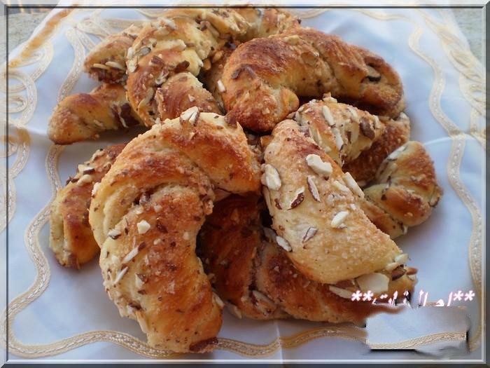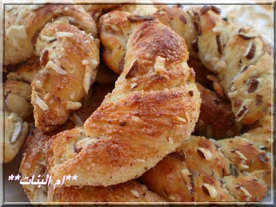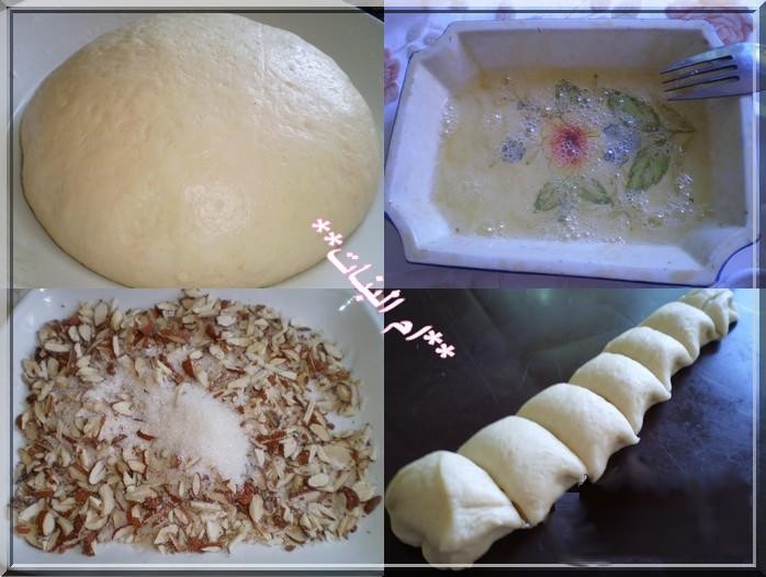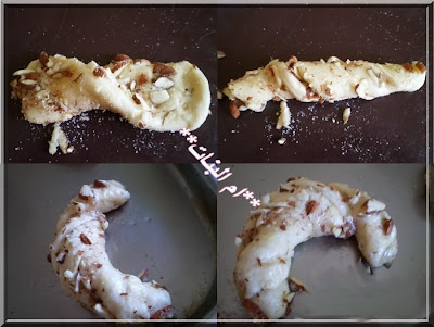 نشكلها حرابل طويلة تقطع الى مربعات نبسطها على شكل هلال نمرره في ابيض البيض المخفوق مع قطرات من الحامض ثم في اللوز مهرمش مخلط مع القليل من السكر ممكن اضافة ملعقة او ملعقتين من القرفة