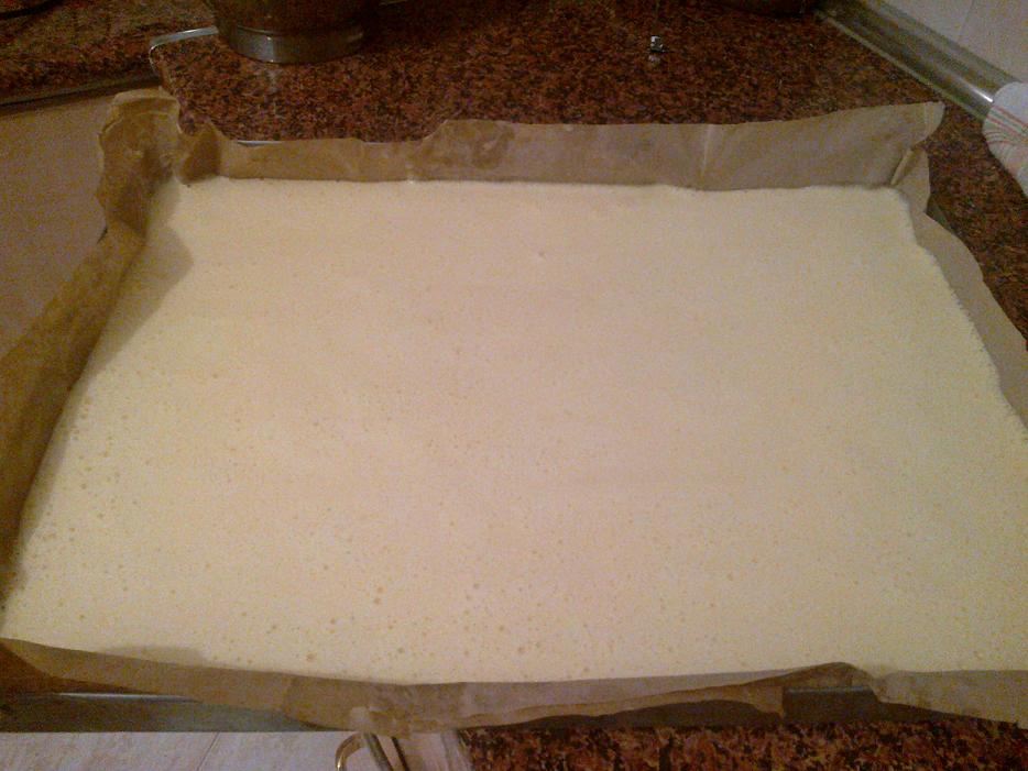 نصب الخليط في قالب الكيك من الحجم الكبير مفروش بورق الزبدة و ندخلها للفرن لا تأخذ وقتا كثيرا في الطهي