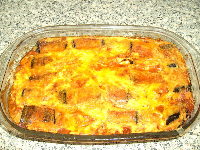 نعمر شرائح الباذنجال بالبطاطس و نلفها و نصففها في صينية فرن مدهونة بالزبدة