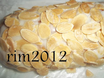 شكلاط البيض مدوب في حمام مائي مع قليل زيت +رقائق لوز محمرين+كوك