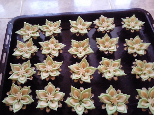 مقادير العجين . 3 زلايف دقيق. نص زلافة مركرين ذائبة . شوية ملح . فانيليا . و تعجني بماء الزهر حتى تتحصلي على عجينة متماسكة و تاخذي شويا من العجين تصبغيها بالون الاخضر تغطيها بكيس بلاستيكي تتركيها على جنب ترتاح