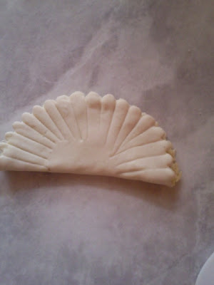 ونضع القطعة المخططة بالسكين نلف الشكل المحصل عليه ونجمع الطرفين ببياض البيض ونضع القليل من الحشوة داخل الدائرة الصغيرة