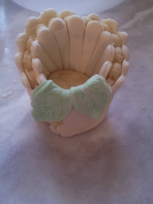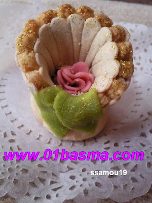 نقطع العجينة الوردية دوائر صغيرة نلفها مرتين حول نفسها نحصل على وردة نحل العجينة الخضراء ونقطع ورقات نثبتهما بابيض البيض