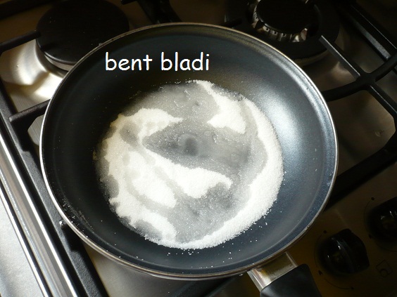 نضع السكر في مقلاة على النار و نتركه حتى يصبح لونه بني