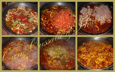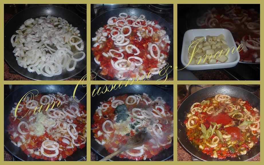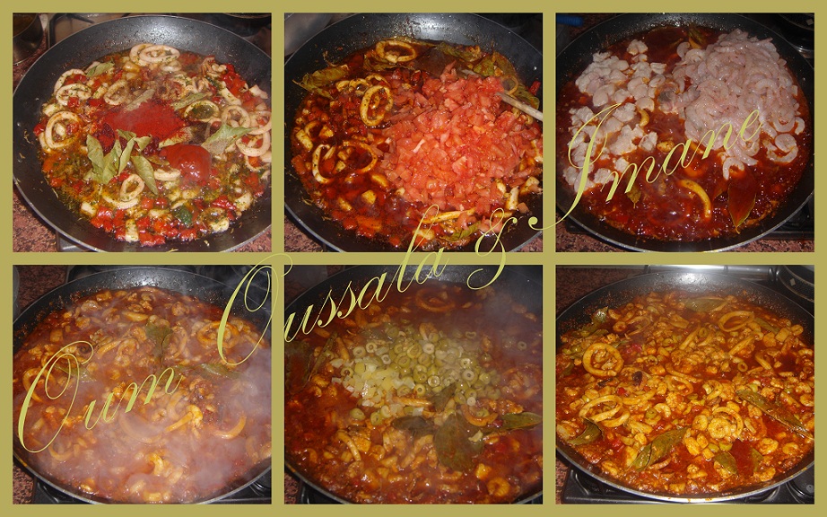 طريقة البسطيلة بالحوت: نعمل الكلمار فالزيت هو الأول ومرة مرة نحرك حتى يبدا يتطرطق غير يبدا يطرطق نعرف انه طاب نضيف عليه الفلفل احمر يدبال ونضيف الثوم محكوك